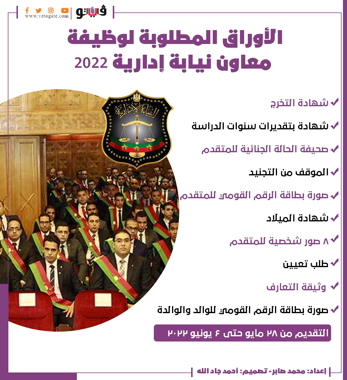الأوراق المطلوبة لوظيفة معاون نيابة إدارية 2022 |إنفو جراف الثلاثاء 24/مايو/2022 - 12:24 م 5/24/2022 12:24:37 PM النيابة الإدارية محمد صابر شارك طباعة 18 حجم الخط شارك طباعة النيابة الإدارية كلية الشرطة بطاقة الرقم القومى الموقع الالكتروني خريجي كليات الحقوق الوظيفة القضائية معاون نيابة ادارية 2022 وظائف النيابة الادارية