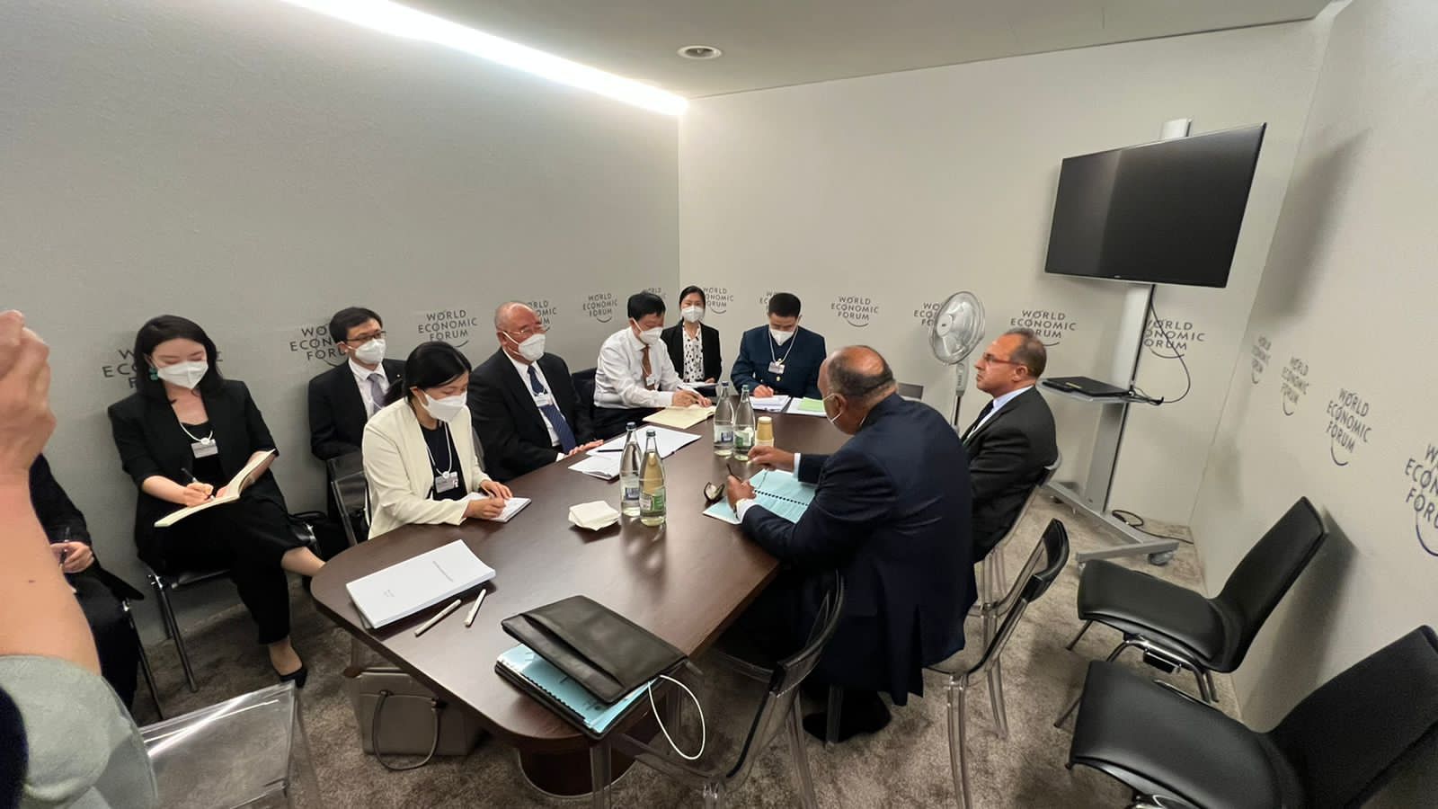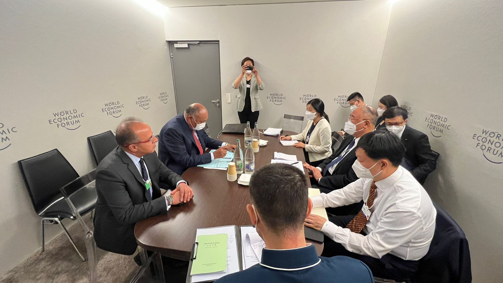 التقى وزير الخارجية سامح شكري، الرئيس المعين للدورة ٢٧ لمؤتمر أطراف اتفاقية الأمم المتحدة الإطارية لتغير المناخ، اليوم الإثنين، مبعوث المناخ الصيني "شي شينهوا" على هامش فعاليات الاجتماع السنوي للمنتدى الاقتصادي العالمي الذي يُعقد بمدينة دافوس السويسرية.
