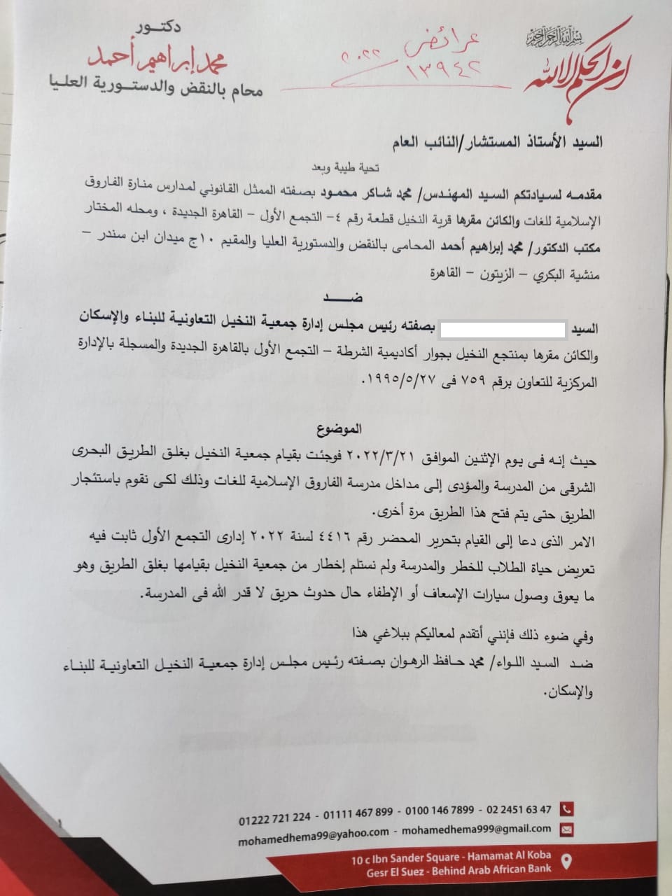 وكان المحامي بصفته وكيلًا عن الممثل القانوني لمدارس منارة الفاروق الإسلامية للغات والكائن مقرها قرية النخيل "التجمع الأول" بالقاهرة الجديدة، أكد في بلاغه إنه فوجئ بقيام جمعية النخيل بغلق الطريق البحري الشرقي من المدرسة والمؤدي إلى مداخل مدرسة الفاروق الإسلامية للغات وذلك لكي نقوم باستئجار الطريق حتى يتم فتح هذا الطريق مرة أخرى، الأمر الذي دعاه إلى القيام بتحرير المحضر رقم 4416 لسنة 2022 إداري التجمع الأول ثابت فيه تعريض حياة الطلاب للخطر لقيامها بغلق الطريق وهو ما يعوق وصول سيارات الإسعاف أو الإطفاء حال حدوث حريق لا قدر الله في المدرسة.