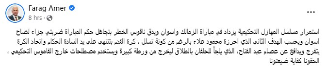 وكتب فرج عامر تدوينة على صفحته الشخصية بموقع التواصل الاجتماعي فيس بوك قائلا: "استمرار مسلسل المهازل التحكيمية يزداد في مباراة الزمالك وأسوان ويدق ناقوس الخطر بتجاهل حكم المباراة ضربتي جزاء لصالح أسوان ويحسب الهدف الثاني الذي أحرزه محمود علاء بالرغم من كونة تسلل".