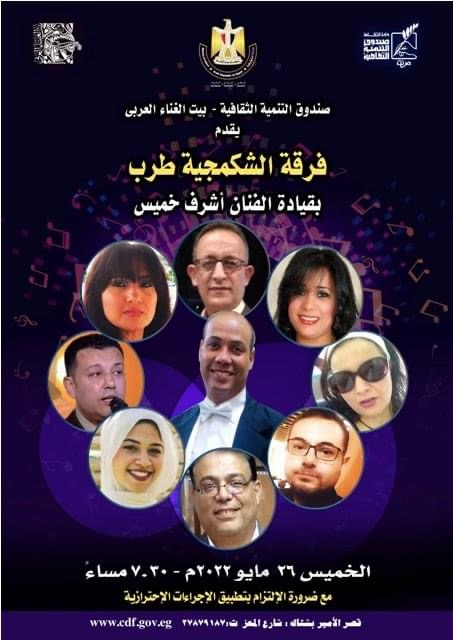 يستضيف بيت الغناء العربي بقصر الأمير بشتاك، في شارع المعز، والتابع لقطاع صندوق التنمية الثقافية في تمام السابعة والنصف من مساء الخميس المقبل الموافق 26 مايو الجاري، حفل فني لفرقة "الشكمجية طرب ".