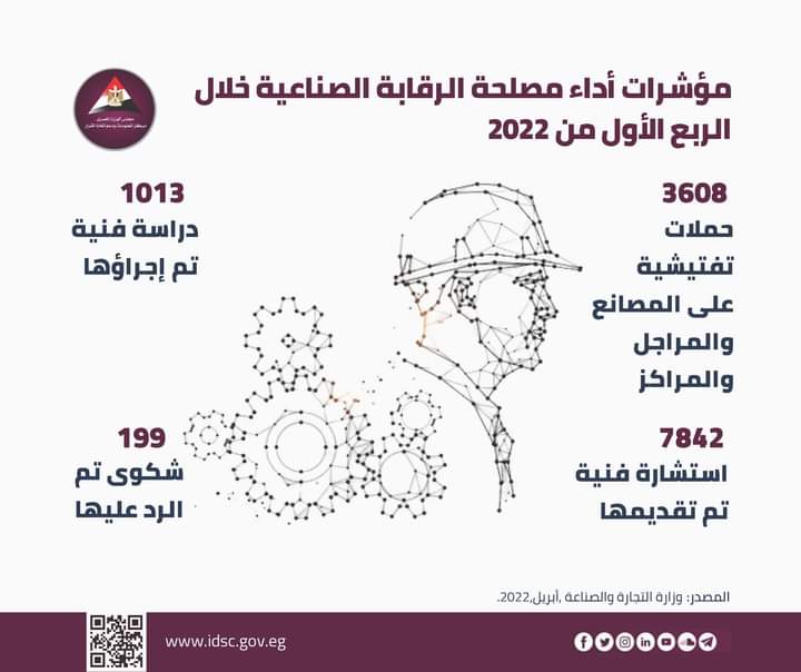 نشر مركز المعلومات ودعم اتخاذ القرار بمجلس الوزراء إنفوجراف جديد تحت عنوان "مؤشر أداء مصلحة الرقابة الصناعية خلال الربع الأول من 2022".