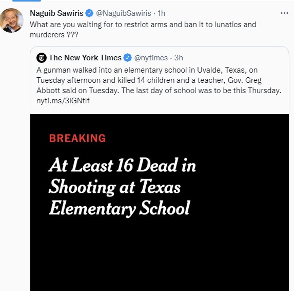 علق رجل الأعمال المهندس نجيب ساويرس، على مجزرة المدرسة الإبتدائية بولاية تكساس، والتي راح ضحيتها 18 تلميذا وثلاثة بالغين، منتقدا السلطات الأمريكية بترك الأسلحة مع أفراد الشعب دون وضع ضوابط لحمل السلاح.