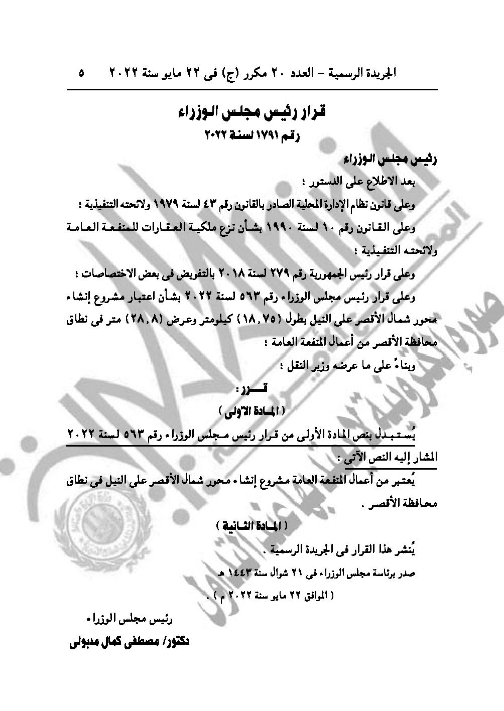 كما نشرت القرار رقم 1791 لسنة 2022، بشأن الاستبدال بنص المادة الأولى من قرار رئيس مجلس الوزراء رقم 563 لسنة 2022، باعتبار مشروع إنشاء محور شمال الأقصر علي النيل في نطاق محافظة الأقصر من أعمال المنفعة العامة.