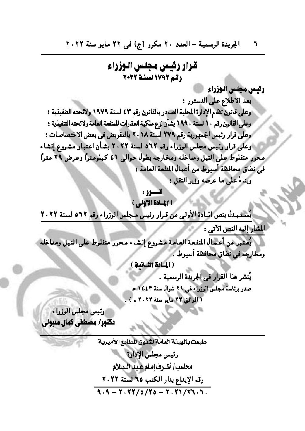 ونشرت أيضا القرار رقم 1792 لسنة 2022، بالاستبدال بنص المادة الأولى من قرار رئيس مجلس الوزراء رقم 562 لسنة 2022 المشار إليه النص الآتي "يُعتبر من أعمال المنفعة العامة مشروع إنشاء محور منفلوط على النيل ومداخله ومخارجه في نطاق محافظة أسيوط"