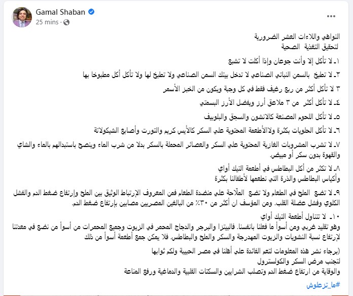 وكتب الدكتور جمال شعبان تدوينة على الفيس بوك قال فيها: النواهي واللاءات العشر الضرورية لتحقيق التغذية الصحية:
