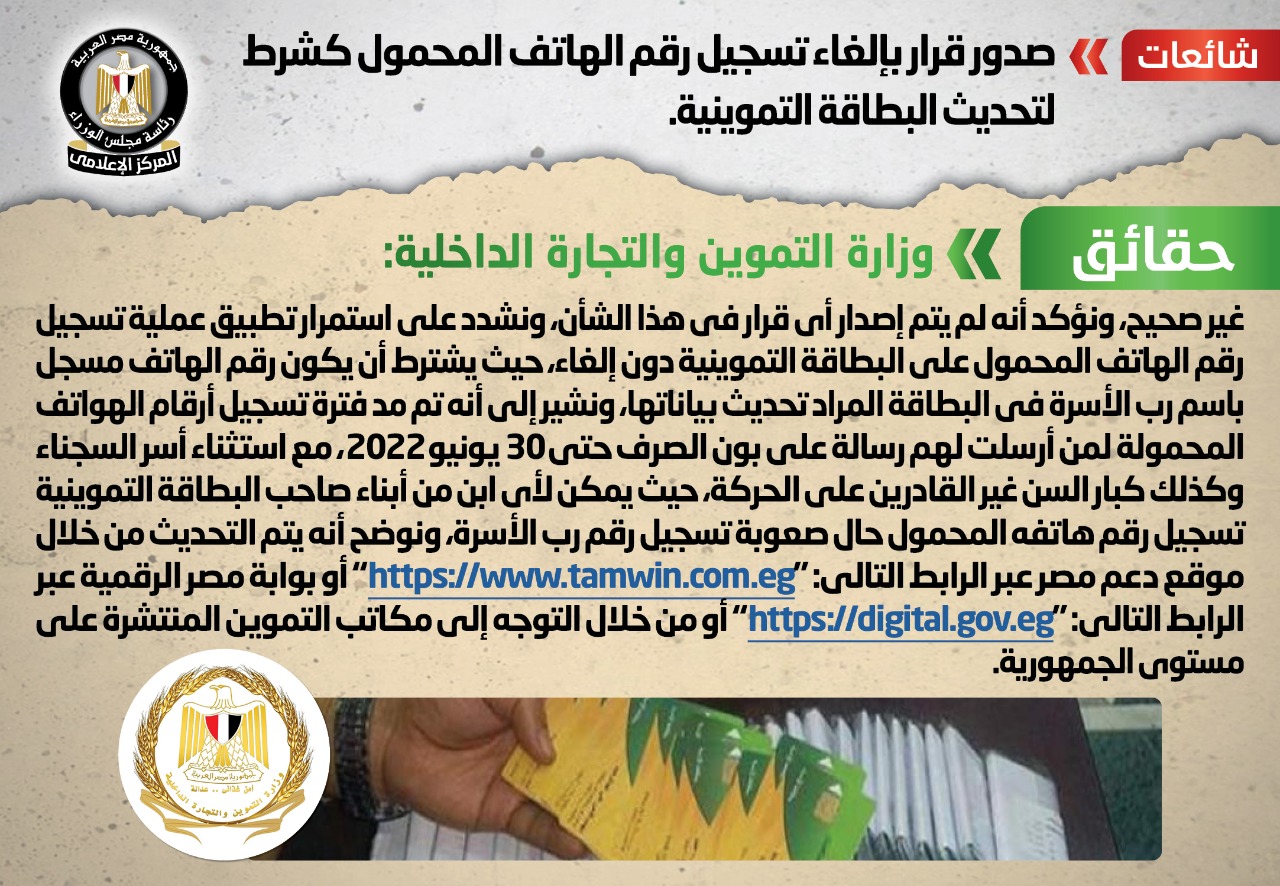 وأكدت وزارة التموين أنه لا صحة لإلغاء تسجيل رقم الهاتف المحمول كشرط لتحديث البطاقة التموينية، وأنه لم يتم إصدار أي قرار في هذا الشأن، مشددةً على استمرار تطبيق عملية تسجيل رقم الهاتف المحمول على البطاقة التموينية دون إلغاء، حيث يشترط أن يكون رقم الهاتف مسجل باسم رب الأسرة في البطاقة المراد تحديث بياناتها.