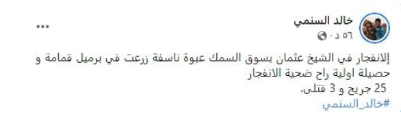 وأشار السنمي إلى أن الحصيلة الأولية للانفجار، هي سقوط 3 قتلى، وإصابة 25 آخرين، قبل أن يرتفع عدد الضحايا إلى أربعة اشخاص، بحسب «إرم».