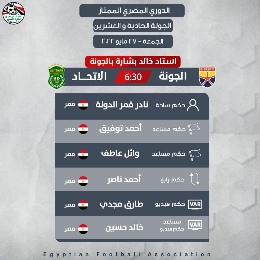 ويدير مباراة الجونة والاتحاد السكندرى الحكم نادر قمر الدولة، ومعه أحمد توفيق ووائل عاطف وأحمد ناصر وطارق مجدى حكم فيديو وخالد حسين مساعد حكم فيديو.
