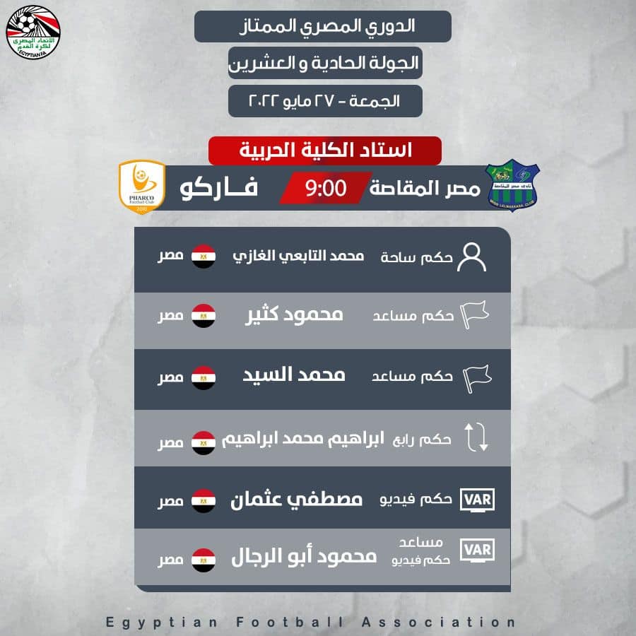 ويدير مباراة مصر المقاصة وفاركو كل من محمد التابعى يعاونه محمود كثير ومحمد السيد وإبراهيم محمد ومصطفى عثمان حكم فيديو ومحمود أبو الرجال مساعد حكم فيديو.