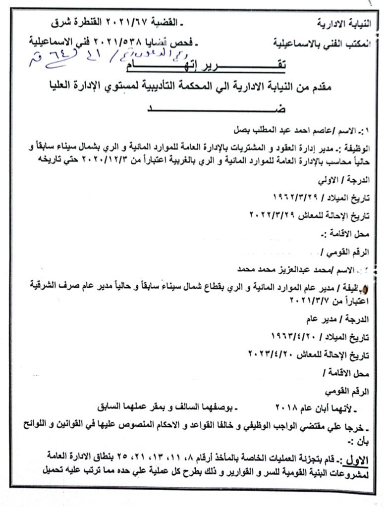إحالة مدير عام صرف الشرقية ومدير عقود ومشتريات ري شمال سيناء للمحاكمة