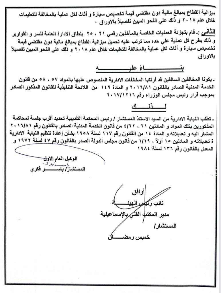 وأنتهت التحقيقات إلى إحالة المخالفين للمحاكمة العاجلة لإرتكابهما مخالفات إدارية منصوص عليها بالمواد أرقام 57 ـ 58 ـ 61 ـ 62، من قانون الخدمة المدنية رقم 81 لسنة 2016، والمادة 149 من اللائحة التنفيذية للقانون الصادرة بموجب قرار رئيس الوزراء رقم 1216 لسنة 2017.