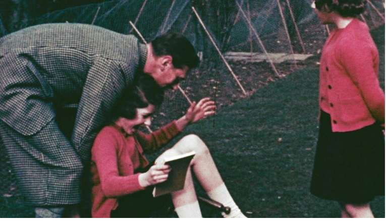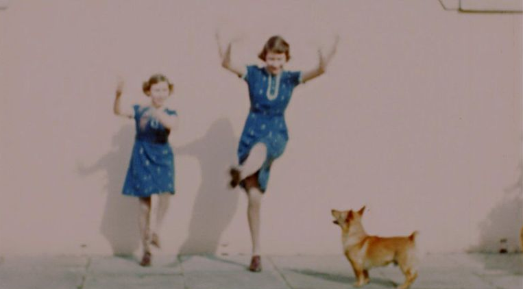 ومن بين اللقطات، مشهد اُلتقط عام 1940 ويظهر الأميرة الشابة إليزابيث وشقيقتها الأميرة مارجريت ترقصان بفساتين منقطة باللونين الأزرق والأبيض.