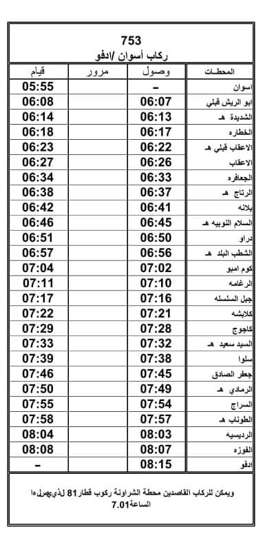 أعلنت الهيئة القومية للسكة الحديد عن تعديل ميعاد قطار ٧٥٣ ركاب أسوان /إدفو ليصبح ميعاد قيامه من محطة أسوان الساعة ٥٥'٥ صباحا بدلا من ٦.١٠ ليتناسب مع مواعيد امتحانات الدبلومات الفنية اعتبارا من يوم ٢٠٢٢/٥/٢٨.