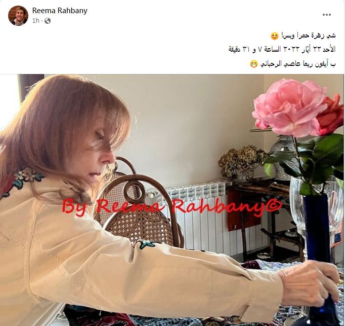 وعلقت ريما الرحباني على الصورة التي ظهرت فيها فيروز وهى تمسك بزهرية من الورد قائلة: "شي زهرة حمرا وبس"، وأشارت إلى موعد التقاط الصورة: "الأحد 22 أيار 2022، الساعة 7 و31 دقيقة".