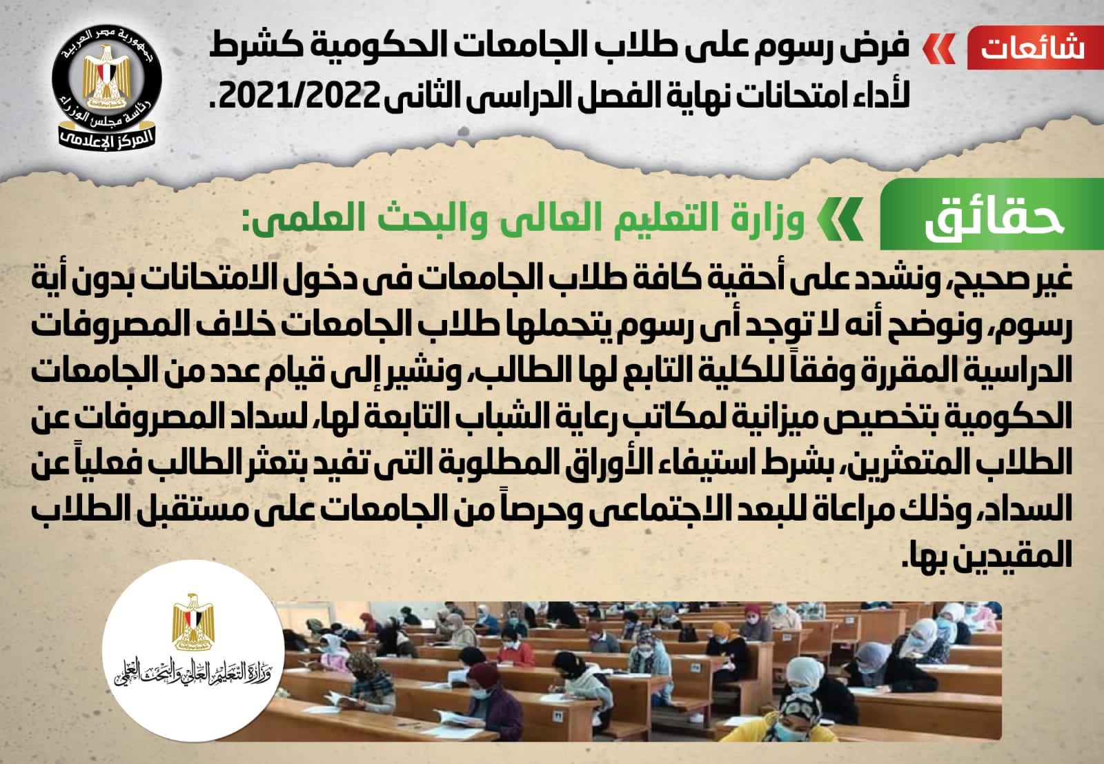 وقام المركز الإعلامي لمجلس الوزراء بالتواصل مع وزارة التعليم العالي والبحث العلمي، والتي نفت تلك الأنباء، مُؤكّدةً أنَّه لا صحة لفرض أي رسوم على طلاب الجامعات الحكومية كشرط لأداء امتحانات نهاية الفصل الدراسي الثاني 2021 /2022، مُشددةً على أحقية كافة طلاب الجامعات في دخول الامتحانات بدون أية رسوم.