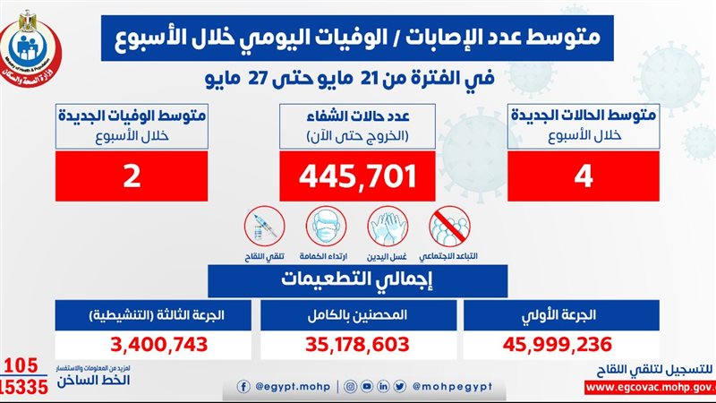يذكر أن عدد الحاصلين على اللقاحات المضادة لفيروس كورونا بلغ 35 مليونًا و178 ألفًا و603 من المحصنين بالكامل حتى الآن، وتناشد الوزارة، المواطنين بالتسجيل على الموقع الإلكتروني للوزارة لتلقي لقاحات فيروس كورونا، والتي تساهم في حماية كافة أفراد الأسرة من الإصابات الشديدة بفيروس كورونا ومتحوراته، مؤكدة أن الدولة المصرية لا تدخر جهدًا في توفير اللقاحات للمواطنين بالمجان، وذلك في إطار حرص الوزارة على الصحة العامة للمواطنين وعلى مكتسبات الدولة في التصدي للجائحة.