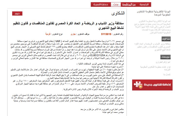 تقدم المهندس محمد عبادة مدير إدارة النظم والمعلومات باتحاد الكرة المصري سابقا، بشكوى إلى مجلس الوزراء عبر بوابة الشكاوى الموحدة، ضد الدكتور أشرف صبحي وزير الشباب والرياضة، ومسؤولي الجبلاية بسبب ما وصفه بـ"مخالفات" في مناقصة توريد وتشغيل أنظمة الفيديو المساعد “VAR”.