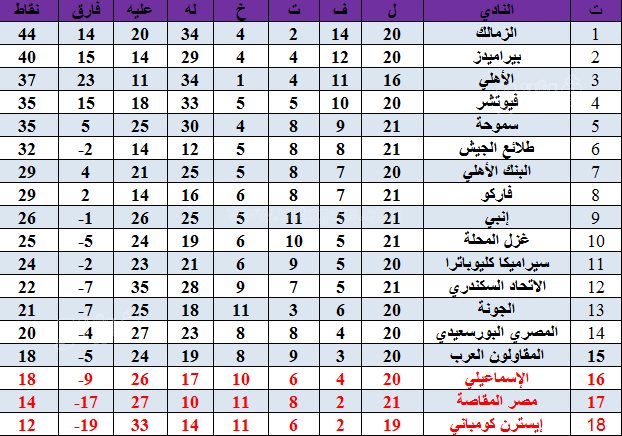 جدول ترتيب الدوري الممتاز بعد فوز الزمالك على الإسماعيلي