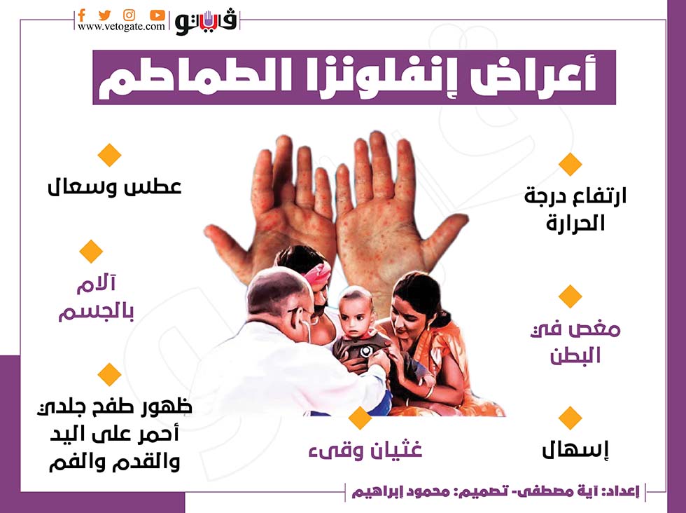 أعراض إنفلونزا الطماطم | انفوجراف الإثنين 30/مايو/2022 - 05:27 م 5/30/2022 5:27:38 PM اعراض انفلونزا الطماطم آية مصطفى شارك طباعة 18 حجم الخط شارك طباعة طفح جلدى انفوجراف انفلونزا انفلونزا الطماطم أعراض انفلونزا الطماطم ارتفاع درجة الحرارة