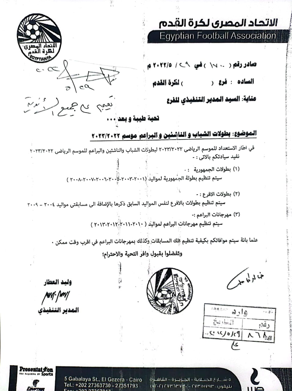 أخطر اتحاد الكرة الفروع التابعة بشكل مسابقات دوري الجمهوريه للناشئين موسم 2022-2023. وأكد اتحاد الكرة في خطابه إقامة دوري الجمهورية مواليد 2001 و2003و2005 و2006 و2007 و2008. وقرر اتحاد الكرة عودة مسابقة مواليد 2004 بعد الغائها بالموسم الماضي، وتقرر إقامة بطولات القطاعات لنفس مواليد دوري الجمهورية للناشئين بالإضافة لمواليد 2004 و2009.