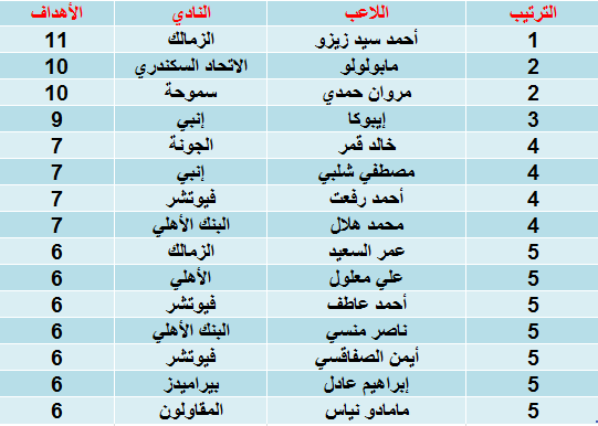 ويتصدر أحمد سيد زيزو جدول ترتيب هدافي الدوري الممتاز برصيد 11 هدفا ويليه مابولولو ومروان حمدي ولكل منهما 10 أهداف.
