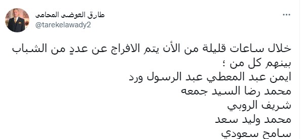 وكتب طارق العوضي تغريدة على تويتر " خلال ساعات قليلة من الأن يتم الافراج عن عددٍ من الشباب بينهم كل من؛ ايمن عبد المعطي عبد الرسول ورد.. محمد رضا السيد جمعه.. شريف الروبي.. محمد وليد سعد.. سامح سعودي".