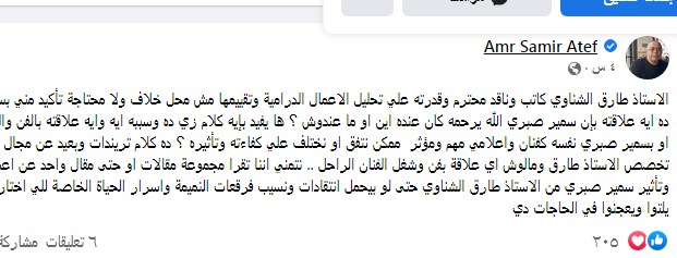 وقال "عمرو":" الأستاذ طارق الشناوي كاتب وناقد محترم وقدرته على تحليل الأعمال الدرامية وتقييمها مش محل خلاف ولا محتاجة تأكيد مني بس كل ده إيه علاقته بإن سمير صبري الله يرحمه كان عنده ابن او ما عندوش ؟ ها يفيد بإيه كلام زي ده وسببه إيه وإيه علاقته بالفن والدراما أو بسمير صبري نفسه كفنان وإعلامي مهم ومؤثر ممكن نتفق أو نختلف علي كفاءته وتأثيره ؟ ده كلام تريندات وبعيد عن مجال تخصص الأستاذ طارق ومالوش أي علاقة بفن وشغل الفنان الراحل.. نتمني إننا تقرا مجموعة مقالات أو حتى مقال واحد عن أعمال وتأثير سمير صبري من الأستاذ طارق الشناوي حتى لو بيحمل انتقادات ونسيب فرقعات النميمة وأسرار الحياة الخاصة للي اختاروا إنهم يلتوا ويعجنوا في الحاجات دي.