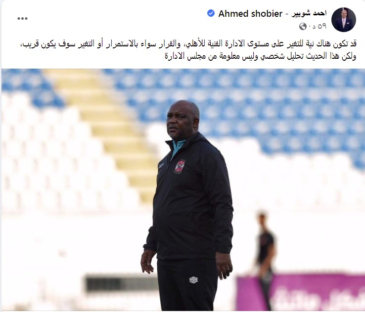 وسبق أن قال شوبير على حسابه الشخصي بموقع التواصل الاجتماعي "فيس بوك": "قد تكون هناك نية للتغير على مستوى الإدارة الفنية للأهلي، والقرار سواء بالاستمرار أو التغيير سوف يكون قريبًا، ولكن هذا الحديث تحليل شخصي وليس معلومة من مجلس الإدارة".