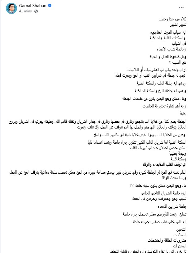 وتساءل الدكتور جمال شعبان عبر صفحته بالفيس بوك: "كلام مهم جدا وخطير.. ايه أسباب الموت المفاجئ والسكتات القلبية والدماغية في الشباب.. وخاصة شباب الأطباء.. وهل ضغوط العمل والحياة هي السبب؟ ازاي واحد يبقى في العشرينيات أو التلاتينات تجيله جلطة في شرايين القلب أو المخ ويموت فجأة.. ويعني ايه جلطة القلب والسكتة القلبية.. ويعني ايه جلطة المخ والسكتة الدماغية.. وهل ممكن وجع البطن يكون من مقدمات الجلطة وايه أهم إشارة تحذيرية للجلطات".