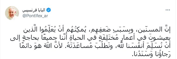 وكتب بابا الفاتيكان البابا فرنسيس تغريدة على تويتر: "إنَّ المسنّين، وبِسَبَبِ ضَعفِهِم، يُمكِنُهُم أنْ يُعَلِّمُوا الَّذين يعيشونَ في أعمارٍ مُختَلِفَةٍ في الحياةِ أنَّنا جميعًا بحاجةٍ إلى أنْ نُسَلِّمَ أنفُسَنا لله، ونَطلُبَ مُساعَدَتَهُ. لأنَّ اللهَ هوَ دائمًا رَجاؤُنا وَسَنَدُنا".