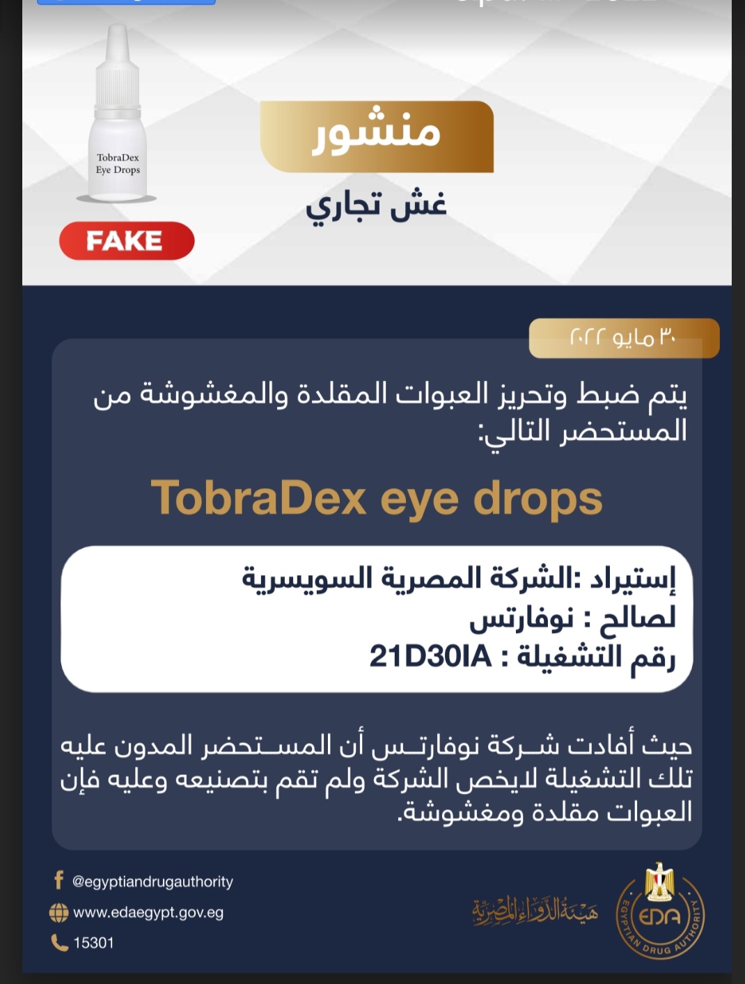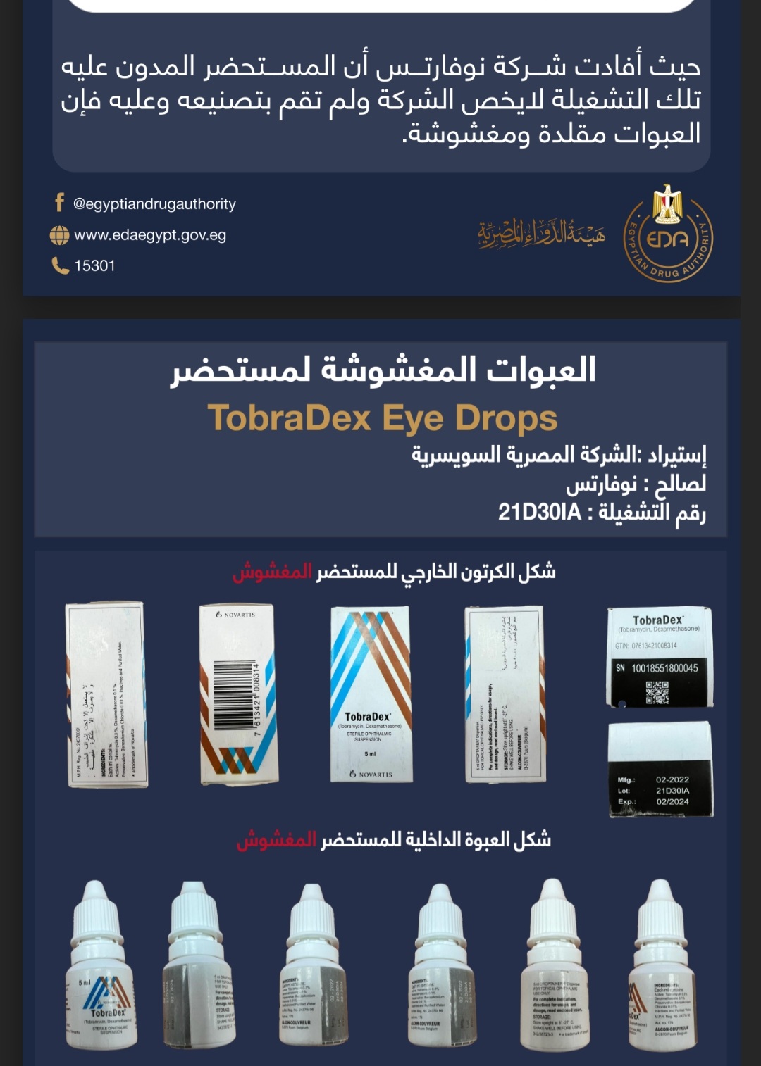 حذرت هيئة الدواء المصرية من غش مستحضر لعلاج العيون قطرة "توبرادكس" وهي مضاد حيوي يستخدم لعلاج التهابات العيون.