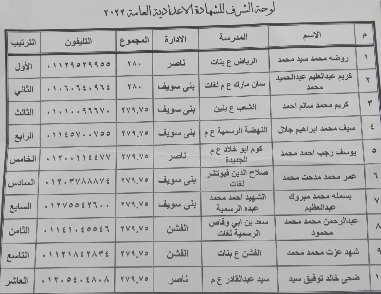 - سيف محمد إبراهيم جلال( 279.75 درجة) مدرسة النهضة الرسمية ع م _بني سويف