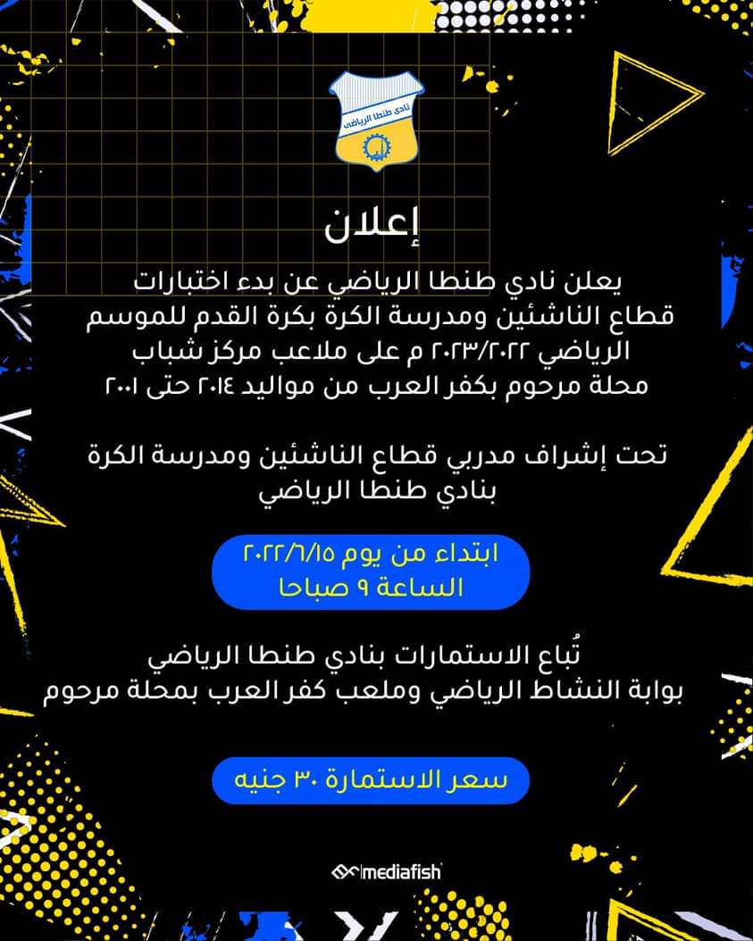 ومن المقرر أن تقام اختبارات الناشئين بنادي طنطا من مواليد 2001 حتى 2014 بمقابل 30 جنيه الاستمارة علما بأن الاستمارات تباع في نادي طنطا الرياضي بوابة النشاط الرياضي وملعب كفر العرب بمحلة مرحوم.