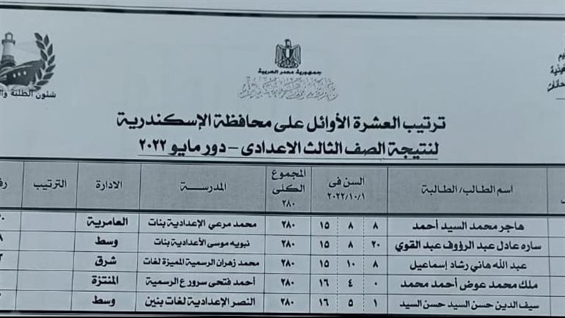 ننشر أسماء أوائل الإعدادية بالإسكندرية