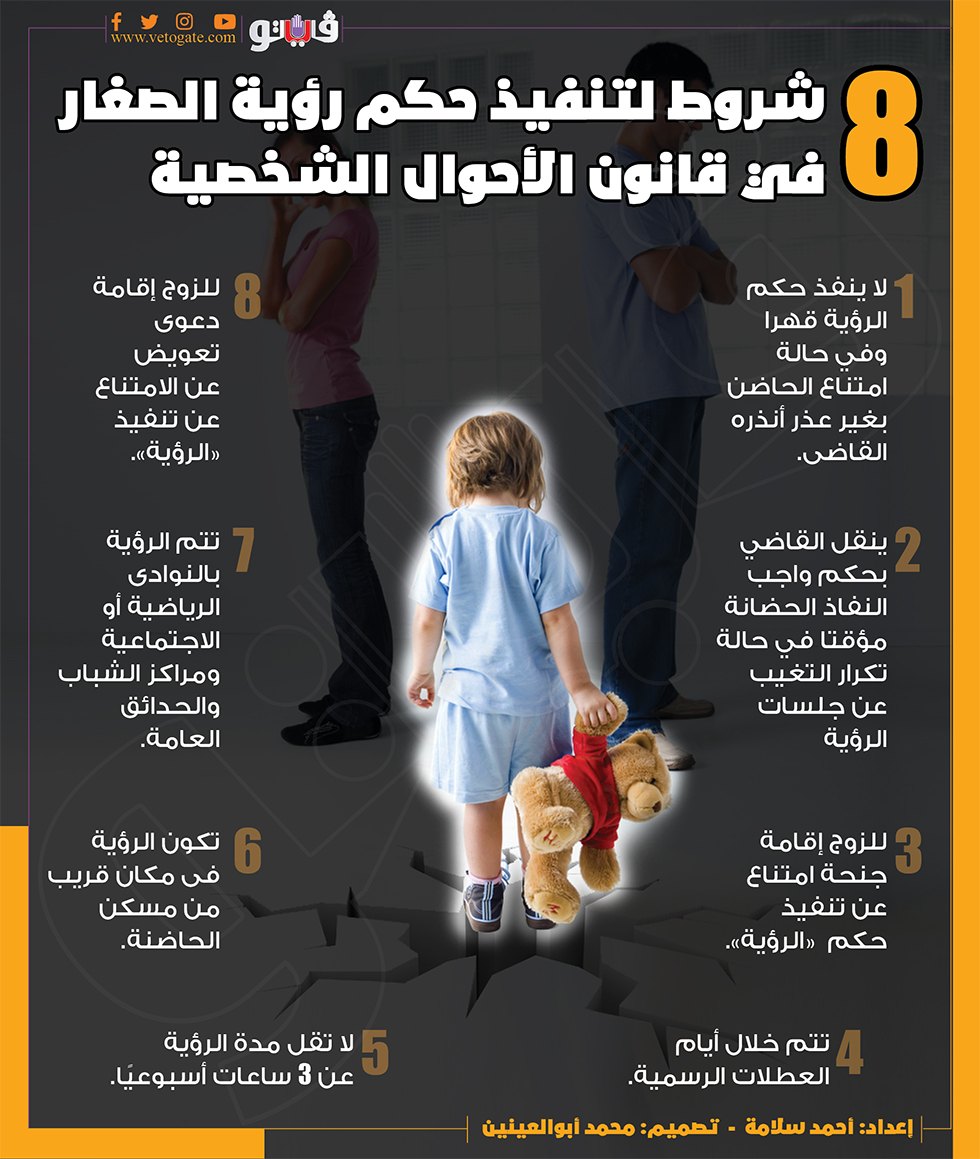 8 شروط لتنفيذ حكم رؤية الصغار في قانون الأحوال الشخصية | إنفوجراف الخميس 02/يونيو/2022 - 06:17 م 6/2/2022 6:17:12 PM محكمة الأسرة أحمد سلامة شارك طباعة 18 حجم الخط شارك طباعة شروط تنفيذ حكم الرؤية 8 شروط لتنفيذ حكم رؤية قانون الأحوال الشخصية حكم رؤية الصغار