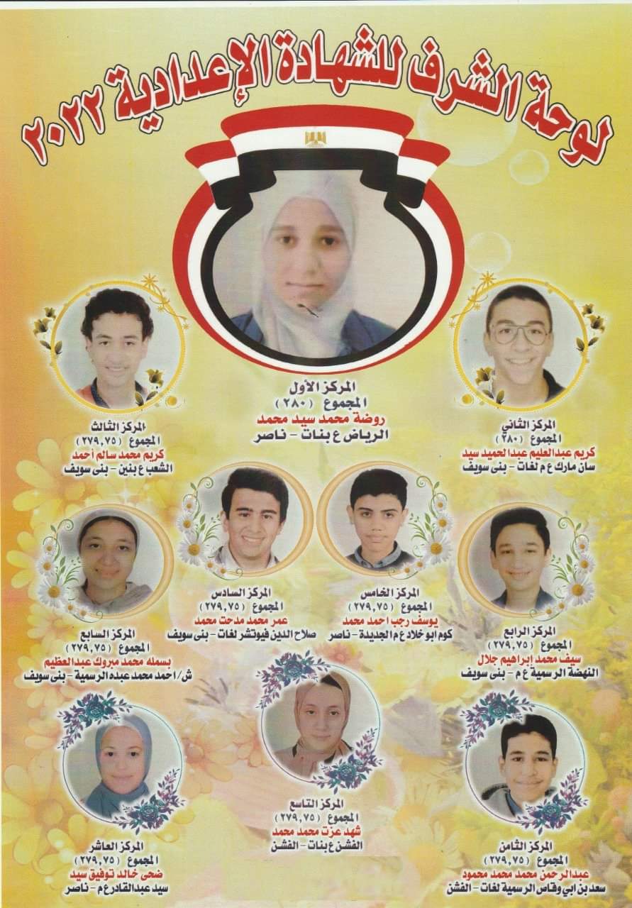 ومن جانبه أكد محمد عبد التواب، وكيل وزارة التربية والتعليم ببني سويف، أن لوحة الشرف العشرة الأوائل على مستوى المحافظة، ضمت كلًّا من: