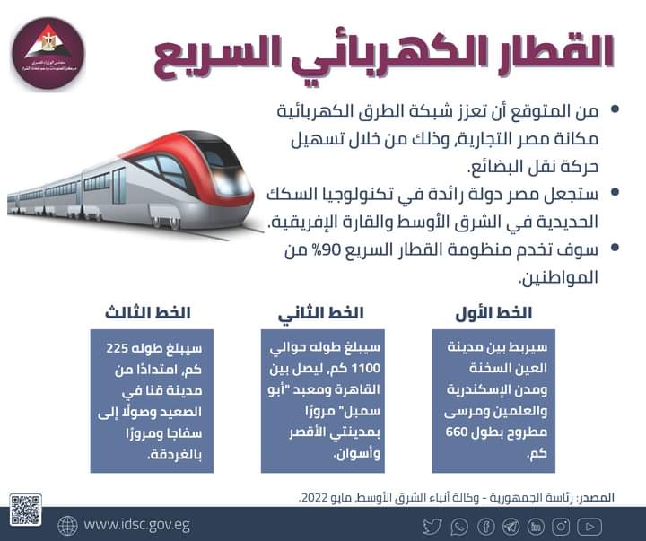 نشر مركز المعلومات ودعم اتخاذ القرار بمجلس الوزراء، إنفوجراف، بشأن خطوط القطار الكهربائي السريع الثلاثة.