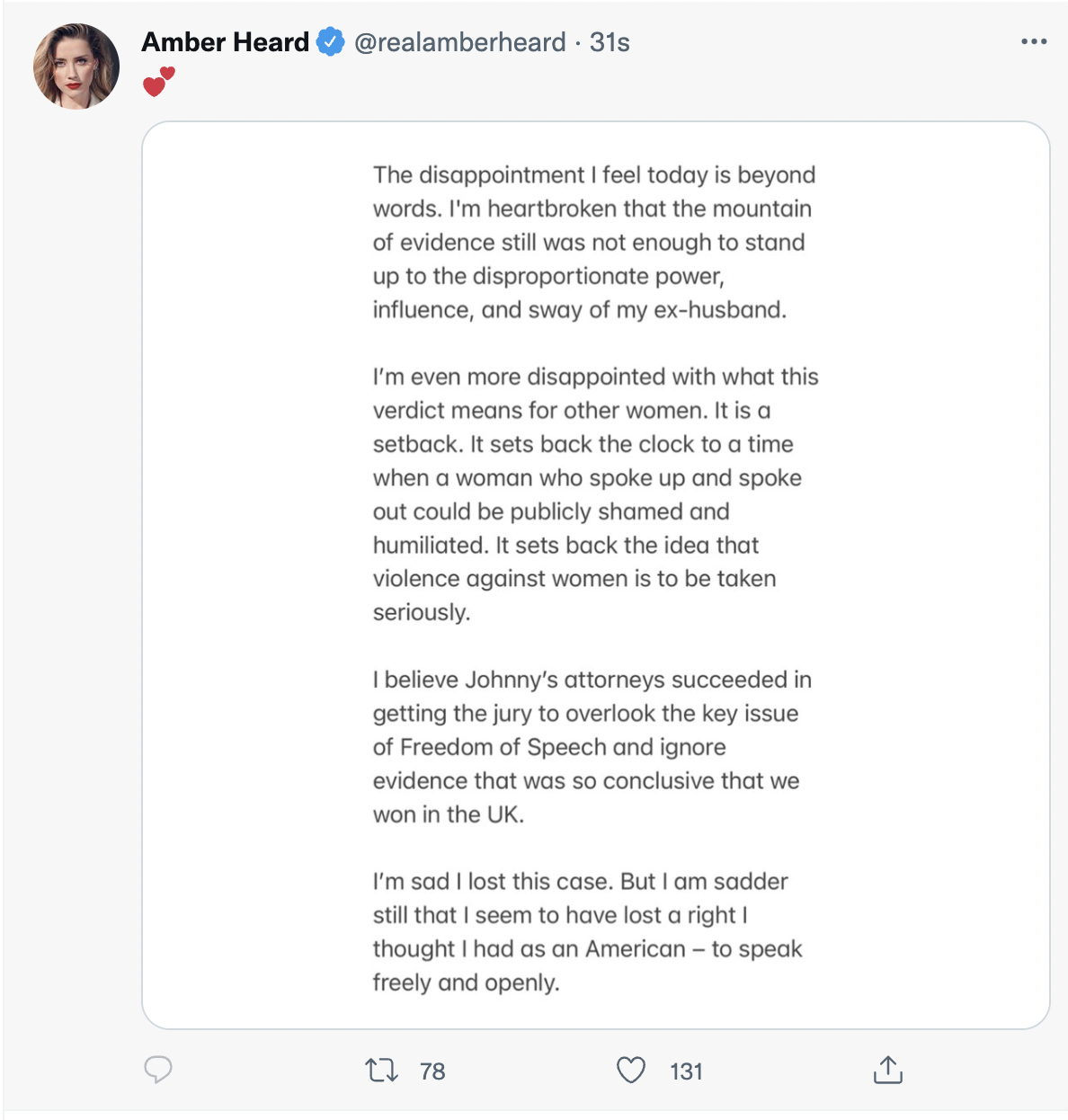 أصدرت الممثلة آمبر هيرد بيانا عبر الحسابات الرسمية لها علي مواقع التواصل الاجتماعي بعد خسارتها لقضية تشويه السمعة ضد طليقها جوني ديب، وقالت آمبر في البيان: "قلبي محطّم.. لا أستطيع وصف مدى إحباطي.، هذا الحكم خطوة للخلف.. عندما لم تستطع المرأة أن تدافع عن حقها..عندما يتم السخرية منها، ووصفها بالعار فقط لأنها قالت الحقيقة"