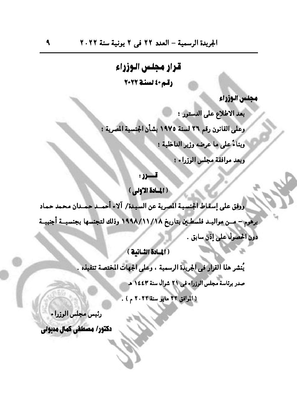 والقرار رقم 40 لسنة 2022، بشأن الموافقة على إسقاط الجنسية المصرية عن آلاء أحمد حمدان محمد حماد برهوم، من مواليد فلسطين في 1998، وذلك لتجنسها بجنسية أجنبية دون الحصول على إذن سابق.