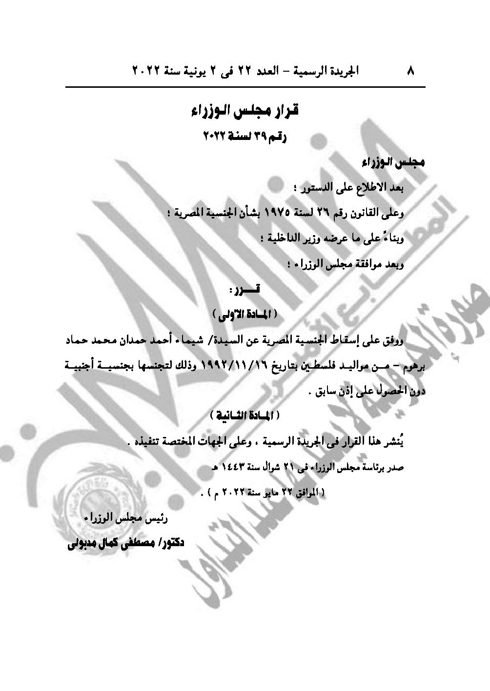 والقرار رقم 39 لسنة 2022، بشأن الموافقة على إسقاط الجنسية المصرية عن شيماء أحمد حمدان محمد حماد برهوم، من مواليد فلسطين في 1992، وذلك لتجنسها بجنسية أجنبية دون الحصول على إذن سابق.