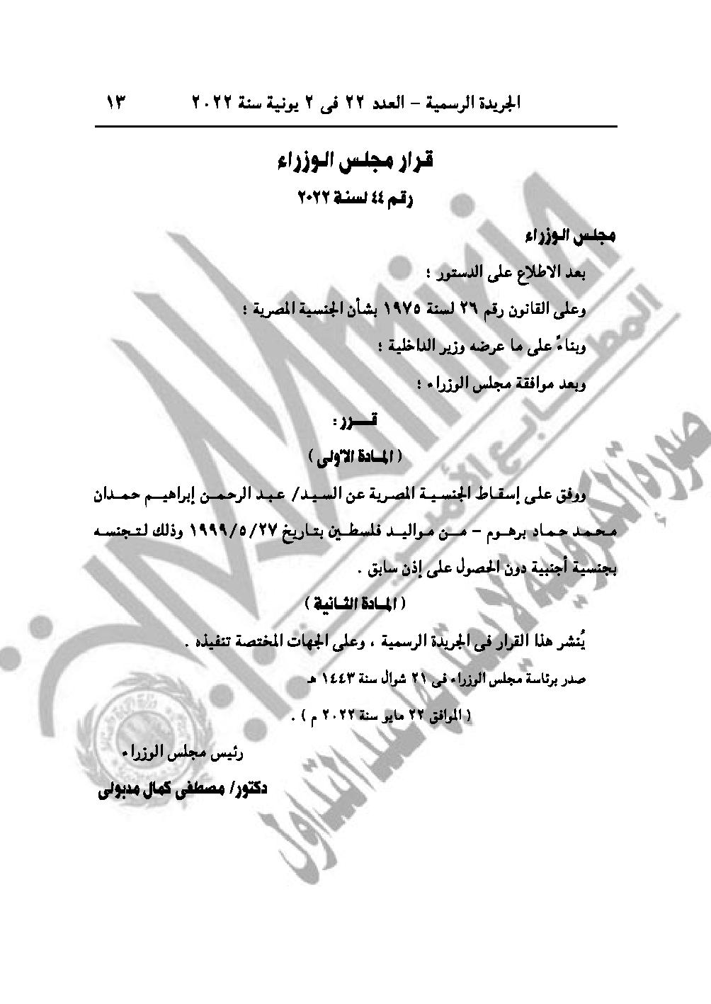 والقرار رقم 44 لسنة 2022، بشأن الموافقة على إسقاط الجنسية المصرية عن عبد الرحمن إبراهيم حمدان محمد حماد برهوم، من مواليد فلسطين في 1999، وذلك لتجنسه بجنسية أجنبية دون الحصول على إذن سابق.