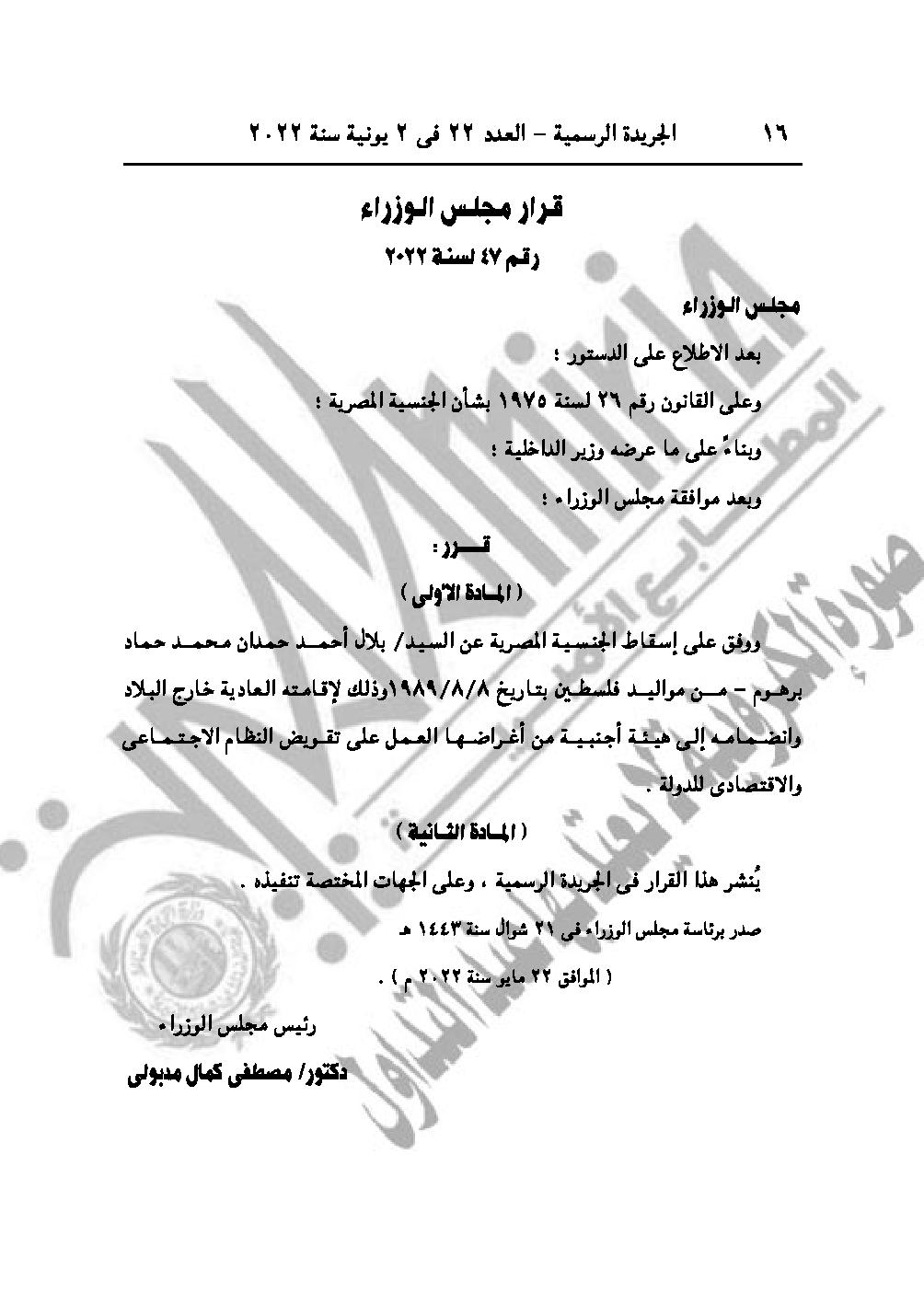 والقرار رقم 47 لسنة 2022، بشأن الموافقة على إسقاط الجنسية المصرية عن بلال أحمد حمدان محمد حماد برهوم، من مواليد فلسطين في 1989، وذلك لإقامته العادية خارج البلاد وانضمامه إلى هيئة أجنبية من أغراضها العمل على تقويض النظام الاجتماعي والاقتصادي للدولة.