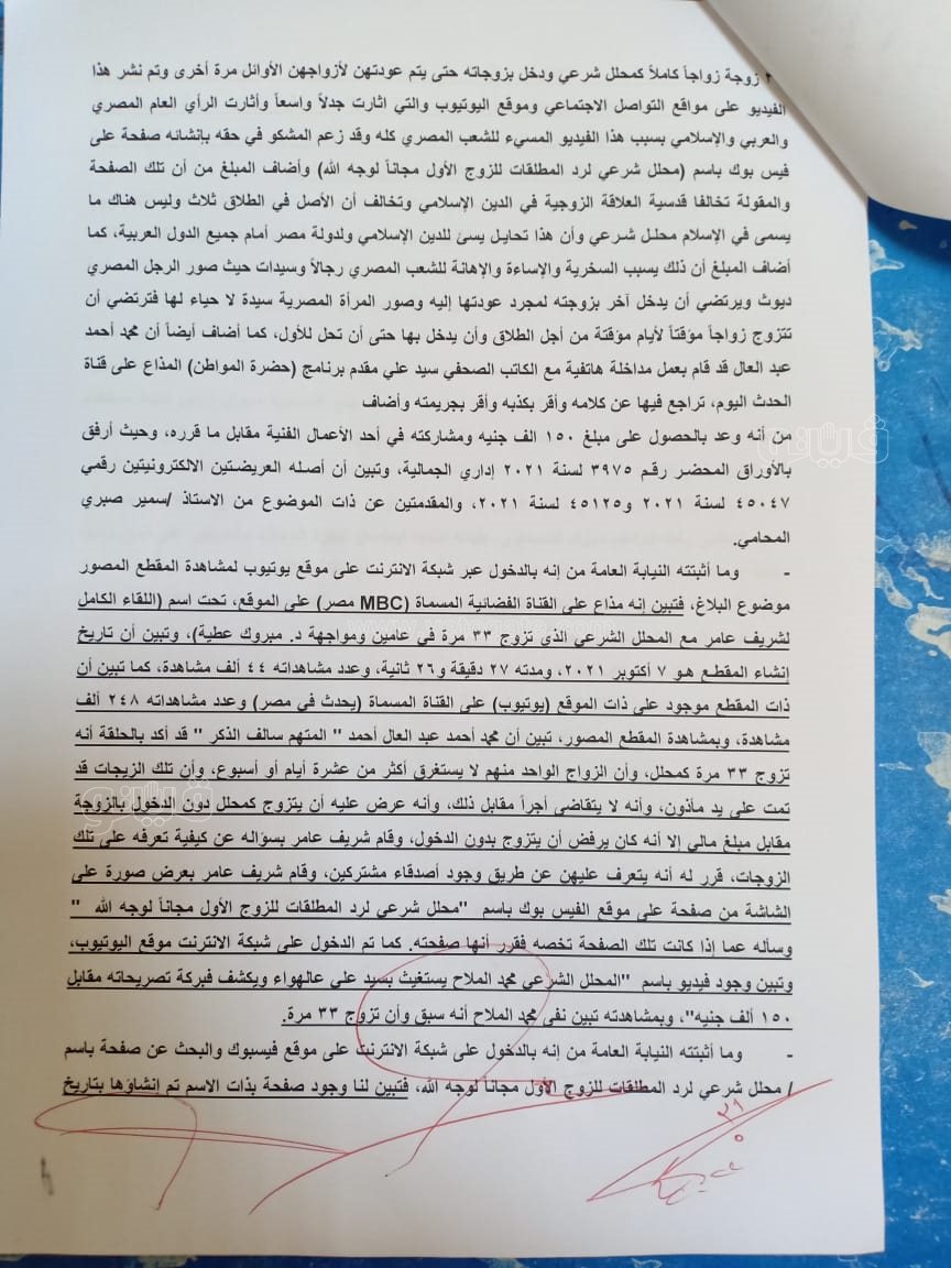وبمشاهدة المقطع المصور تبين أن محمد أحمد عبدالعال أحمد "المتهم سالف الذكر"، قد أكد بالحلقة أنه تزوج ٣٣ مرة كمحلل، وأن الزواج الواحد منهم لا يستغرق أكثر من عشرة أيام أو أسبوع وأن تلك الزيجات قد تمت علي يد مأذون وأنه لا يتقاضى أجرا مقابل ذلك، وأنه عرض عليه أن يتزوج كمحلل دون الدخول بالزوجة مقابل مبلغ مالي إلا أنه كان يرفض أن يتزوج بدون الدخول، وقام شريف عامر بسؤاله بعرض صورة علي الشاشة من صفحة علي موقع "فيسبوك" باسم ( محلل شرعي لرد المطلقات للزوج الأول مجانا لوجه الله ) وسأله عما إذا كانت تلك الصفحة تخصه فقرر أنها صفحته، كما تم الدخول علي شبكة الانترنت موقع (يوتيوب) وتبين وجود فيديو باسم ( المحلل الشرعي محمد الملاح يستغيث بسيد علي الهواء ويكشف فبركة تصريحاته مقابل ١٥٠ ألف جنية ) وبمشاهدته تبين نفي محمد الملاح أنه سبق وأن تزوج ٣٣ مرة.