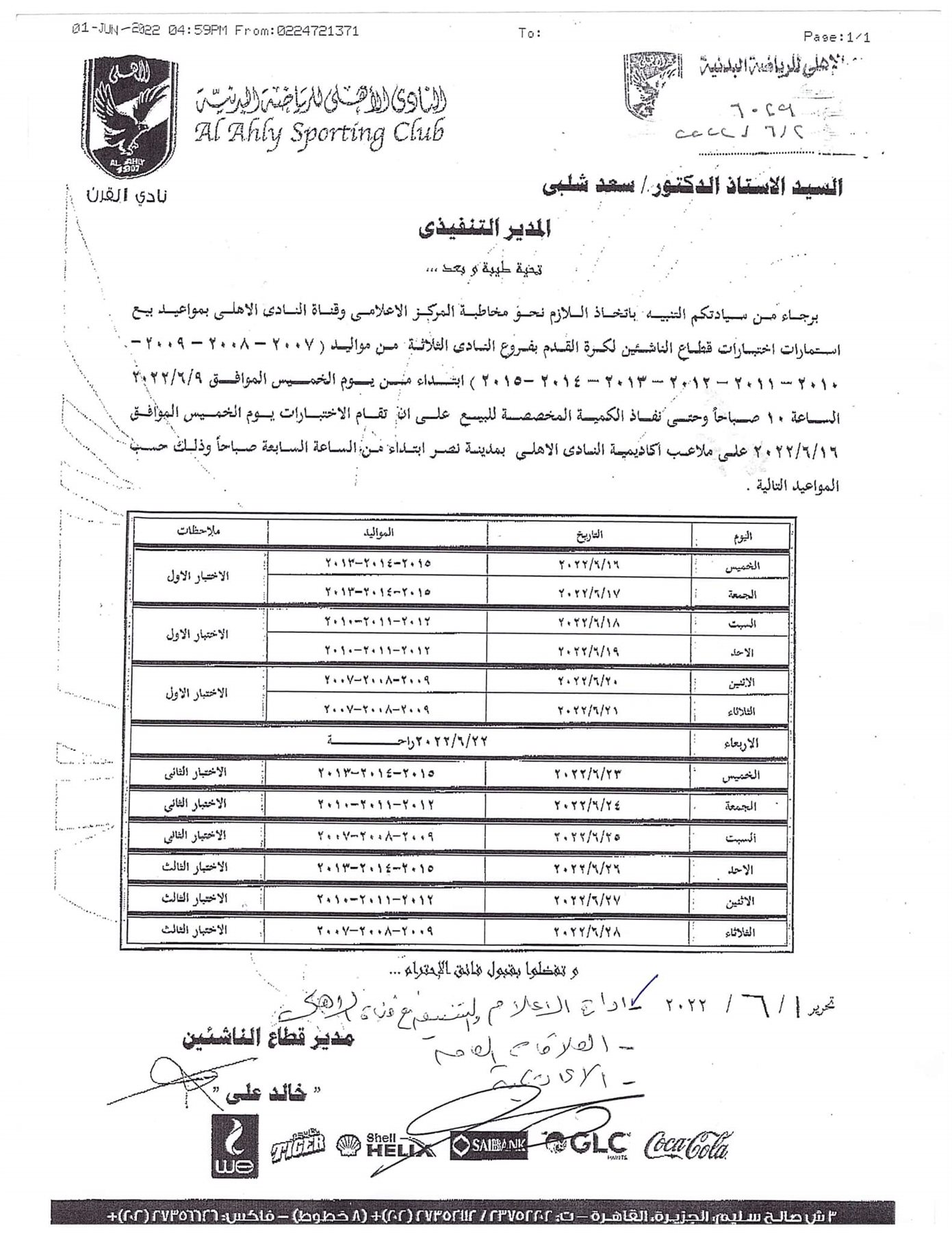 ومن المقرر أن تقام اختبارات الناشئين موسم 2022-2023، لمواليد 2001 و2002 و2003 و2004 و2005 و2006 و2007 و2008.