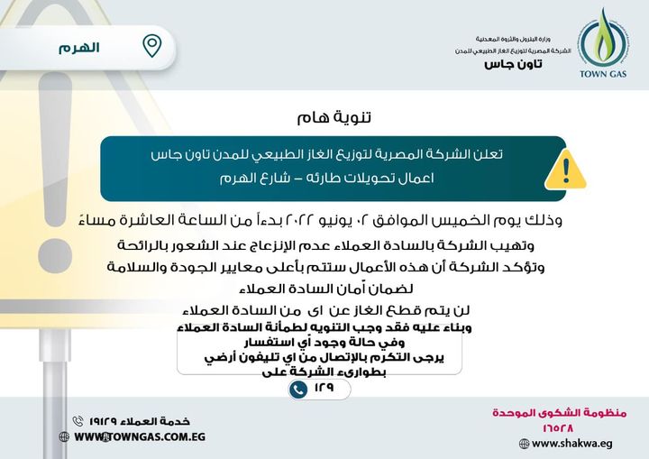 وكتبت الصفحة الرسمية للشركة على موقع التواصل الاجتماعي "فيسبوك": تعلن الشركة المصرية لتوزيع الغاز الطبيعي للمدن "تاون جاس" عن أعمال تحويلات طارئة في شارع الهرم وذلك اليوم الخميس الموافق 2 يونيو 2022 بدْا من الساعة العاشرة مساءً".