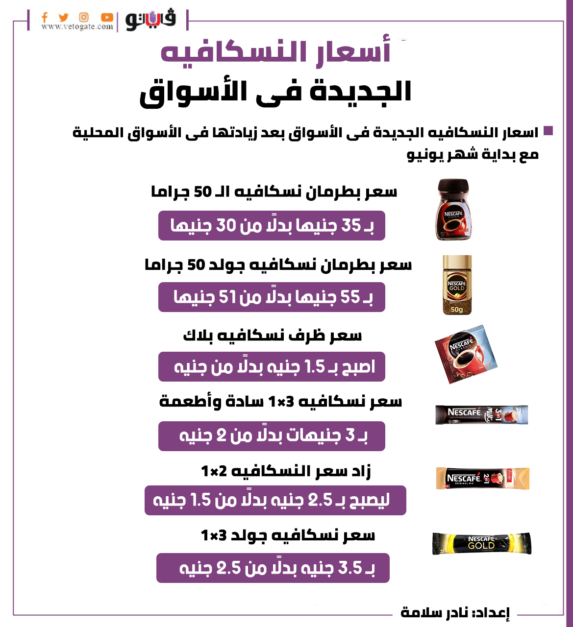 أسعار النسكافيه الجديدة في الأسواق الجمعة 03/يونيو/2022 - 12:12 م 6/3/2022 12:12:29 PM أسعار النسكافيه الجديدة فى الأسواق نادر سلامة شارك طباعة 18 حجم الخط شارك طباعة اسعار ا الأسواق المحلية النسكافيه الأسواق