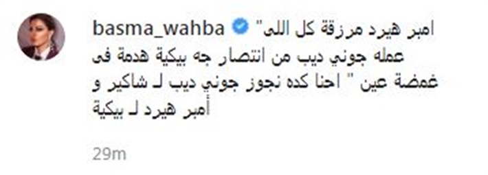 وكتبت بسمة وهبة: "أمبر هيرد مرزقة، كل اللى عمله جوني ديب من انتصار جه بيكيه هدمه فى غمضة عين".