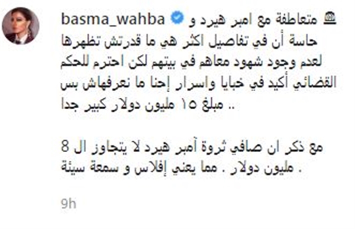 وكانت بسمة وهبة قد أعلنت قبل ساعات عن تعاطفها مع أمبر هيرد وشعورها بأنها مظلومة، وكتبت: " متعاطفة مع أمبر هيرد وحاسة أن في تفاصيل أكثر هي ما قدرتش تظهرها لعدم وجود شهود معاهم في بيتهم".