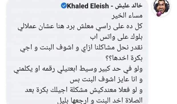 وقال عليش:" مساء الخير كل ده علي راسي معلش برد هنا عشان هي عملالي بلوك علي الوتس آب نقدر نحل مشكلتنا إزاي وأشوف البنت وأجي بكرة أخدها ؟؟ ولو في حد كبير ووسيط ابعتيلي رقمه أو يكلمني وأنا عاوز أشوف البنت بس، ولو فعلا معندكيش مشكلة اجيلك بكرة بعد الصلاة أخد البنت وأرجعها بليل.